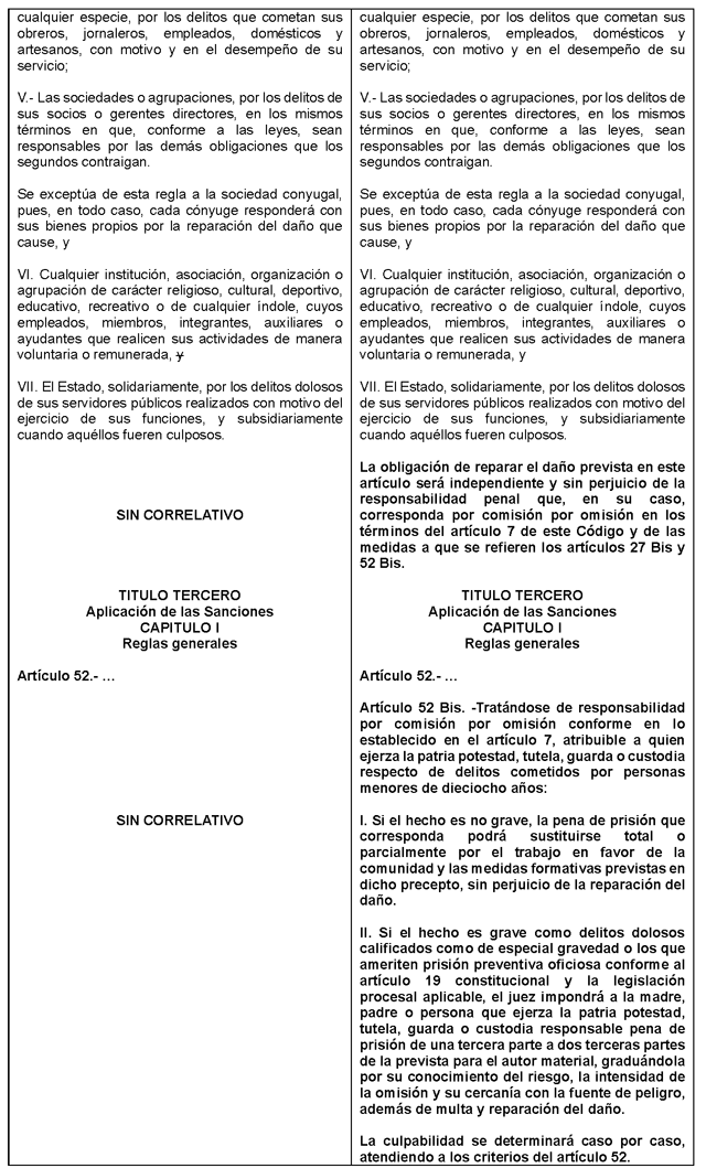 Artículo Único. Se adicionan los párrafos tercero y cuarto, pasando el actual párrafo tercero a ser párrafo quinto del artículo 7o.; se adiciona un artículo 27 Bis y 52 Bis; se adiciona un párrafo segundo al artículo 32, todos estos del Código Penal Federal para quedar como sigue: