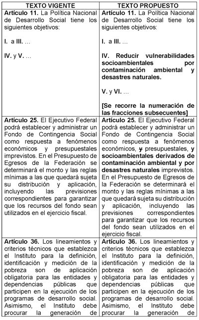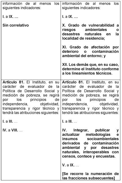 Decreto por el que se reforman y adicionan los artículos 11, 25, 36 y 81 de la Ley General de Desarrollo Social, en materia de inclusión de indicadores de contaminación ambiental y de desastres naturales en la medición de la pobreza