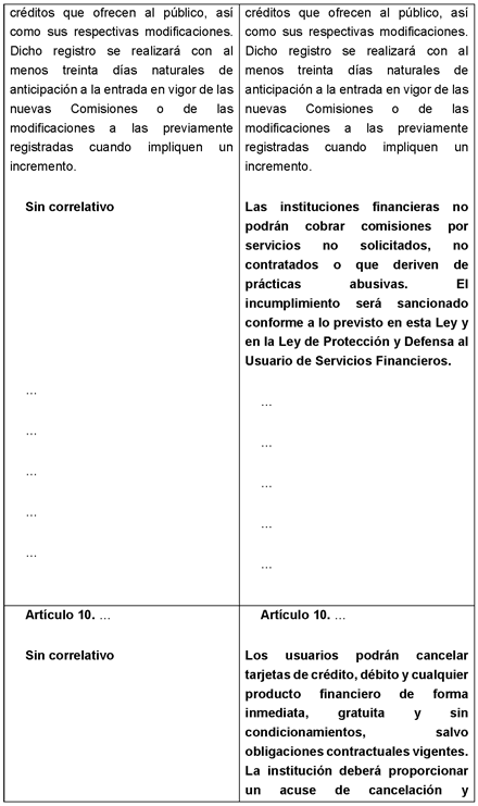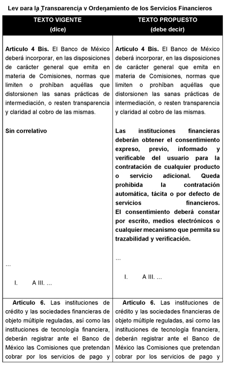 En este sentido se observa la necesidad de reformar la Ley para la Transparencia y Ordenamiento de los Servicios Financieros , en la iniciativa de reforma se elabora el cuadro comparativo del texto actual y la propuesta que sustenta esta exposición de motivos, como a continuación se muestra:
