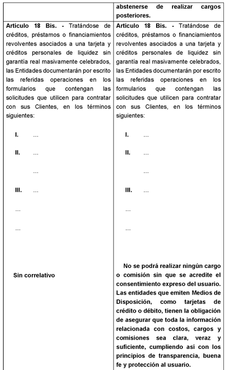 Artículo 18 Bis. Tratándose de créditos, préstamos o financiamientos revolventes asociados a una tarjeta y créditos personales de liquidez sin garantía real masivamente celebrados, las Entidades documentarán por escrito las referidas operaciones en los formularios que contengan las solicitudes que utilicen para contratar con sus Clientes, en los términos siguientes: