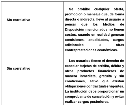 Se prohíbe cualquier oferta, promoción o mensaje que, de forma directa o indirecta, lleve al usuario a pensar que los Medios de Disposición mencionados no tienen costos, cuando en realidad generan comisiones, anualidades, cargos adicionales u otras contraprestaciones económicas.