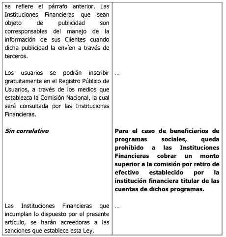 Por ello, la presente iniciativa tiene como objetivo establecer en la Ley de Protección y Defensa al Usuario de Servicios Financieros, la prohibición de que las instituciones financieras cobren una comisión superior a la del Banco del Bienestar, cuando se trate de retiro de efectivo de programas sociales (hoy programas del bienestar).