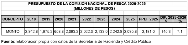 Como se observa en el cuadro anterior, el presupuesto asignado a la CONAPESCA ha sido muy variable en el periodo 2018-2025. Para 2026, se contempla en el Proyecto de Presupuesto de Egresos un monto de 2 mil 181.2 millones de pesos lo que significa un incremento de 7.1% en términos nominales con relación al presupuesto aprobado en el 2025. En el 2018 se registra la mayor asignación de recursos para la CONAPESCA, y en 2020 se registra el menor monto para dicha Comisión.