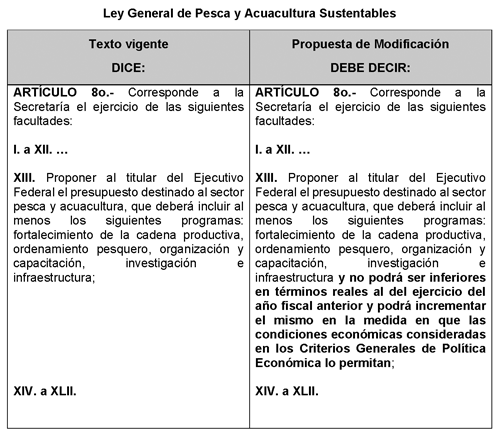 XIII. Proponer al titular del Ejecutivo Federal el presupuesto destinado al sector pesca y acuacultura, que deberá incluir al menos los siguientes programas: fortalecimiento de la cadena productiva, ordenamiento pesquero, organización y capacitación, investigación e infraestructura y no podrá ser inferiores en términos reales al del ejercicio del año fiscal anterior y se incrementará en la medida en que las condiciones económicas consideradas en los Criterios Generales de Política Económica lo permitan;