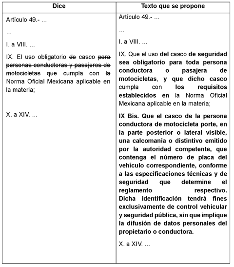 IX Bis. Que el casco de la persona conductora de motocicleta porte, en la parte posterior o lateral visible, una calcomanía o distintivo emitido por la autoridad competente, que contenga el número de placa del vehículo correspondiente, conforme a las especificaciones técnicas y de seguridad que determine el reglamento respectivo.