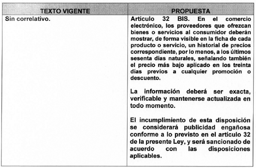 Artículo 32 Bis. En el comercio electrónico, los proveedores que ofrezcan bienes o servicios al consumidor deberán mostrar, de forma visible en la ficha de cada producto o servicio, un historial de precios correspondiente, por lo menos, a los últimos sesenta días naturales, señalando también el precio más bajo aplicado en los treinta días previos a cualquier promoción o descuento.