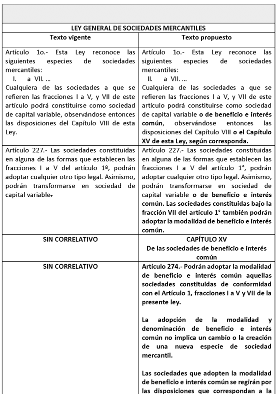 Artículo Único. Se reforman los artículos 1° y 227, y se adiciona el Capítulo XV denominado De las sociedades de beneficio e interés común, y los artículos 274, 275, 276, 277, 278, 279, 280, 281, 282 y 283, todos de la Ley General de Sociedades Mercantiles, para quedar como sigue: