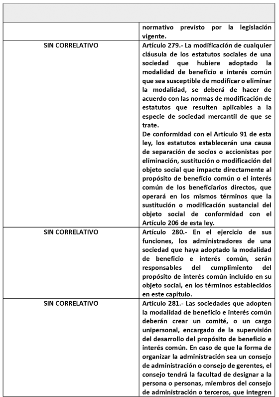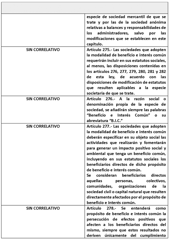 Artículo 277.- Las sociedades que adopten la modalidad de beneficio e interés común deberán especificar en su objeto social las actividades que realizarán y fomentarán para generar un impacto positivo social y ambiental que tenga un beneficio común, incluyendo en sus estatutos sociales los beneficiarios directos de dicho propósito de beneficio e interés común.