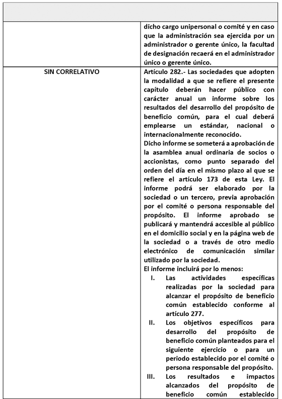 Artículo 282.- Las sociedades que adopten la modalidad a que se refiere el presente capítulo deberán hacer público con carácter anual un informe sobre los resultados del desarrollo del propósito de beneficio común, para el cual deberá emplearse un estándar, nacional o internacionalmente reconocido.