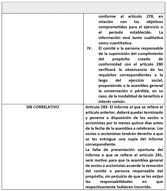 IV. El comité o la persona responsable de la supervisión del cumplimiento del propósito creado de conformidad con el artículo 280 verificará la observancia de los requisitos correspondientes a lo largo del ejercicio social, proponiendo a la asamblea general la conservación o pérdida, en su caso, de la modalidad de beneficio e interés común.