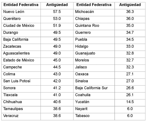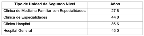 De manera más exacta, la siguiente tabla muestra la antigüedad promedio por entidad federativa registrada en las unidades médicas de segundo nivel: