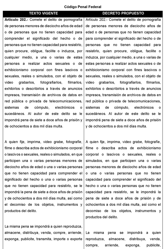 Por lo anteriormente expuesto, y con el objeto de mostrar de manera más clara las modificaciones que se pretende llevar a cabo en el Código Penal Federal, se presenta el siguiente cuadro: