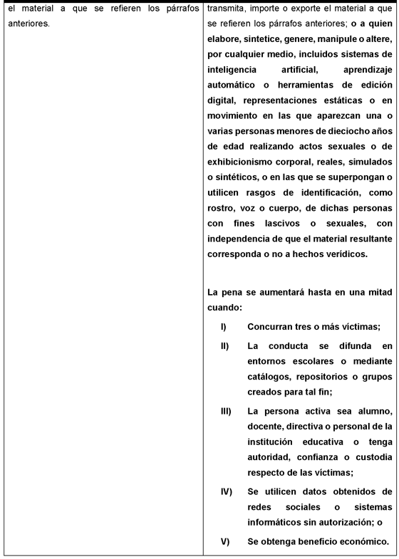 La misma pena se impondrá a quien reproduzca, almacene, distribuya, venda, compre, arriende, exponga, publicite, transmita, importe o exporte el material a que se refieren los párrafos anteriores; o a quien elabore, sintetice, genere, manipule o altere, por cualquier medio, incluidos sistemas de inteligencia artificial, aprendizaje automático o herramientas de edición digital, representaciones estáticas o en movimiento en las que aparezcan una o varias personas menores de dieciocho años de edad realizando actos sexuales o de exhibicionismo corporal, reales, simulados o sintéticos, o en las que se superpongan o utilicen rasgos de identificación, como rostro, voz o cuerpo, de dichas personas con fines lascivos o sexuales, con independencia de que el material resultante corresponda o no a hechos verídicos.