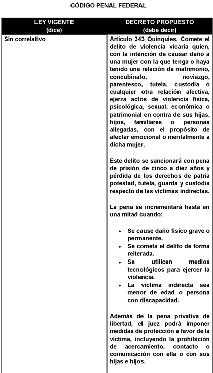 Artículo 343 Quinquies. Comete el delito de violencia vicaria quien, con la intención de causar daño a una mujer con la que tenga o haya tenido una relación de matrimonio, concubinato, noviazgo, parentesco, tutela, custodia o cualquier otra relación afectiva, ejerza actos de violencia física, psicológica, sexual, económica o patrimonial en contra de sus hijas, hijos, familiares o personas allegadas, con el propósito de afectar emocional o mentalmente a dicha mujer.