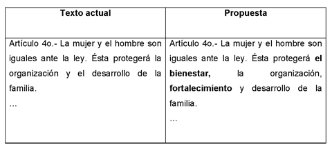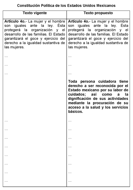 A continuación, el cuadro comparativo mediante el que se permite identificar fácilmente la propuesta de reforma al texto constitucional en materia de derechos de las personas cuidadoras.