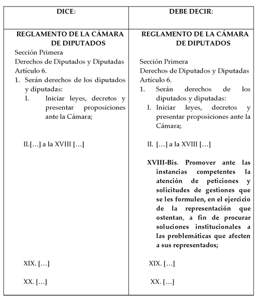 Por ello, se propone adicionar la fracción XVIII-Bis al artículo 6 del Reglamento de la Cámara de Diputados, a fin de formalizar la facultad de gestión de los legisladores ante instancias gubernamentales, armonizándolas con las atribuciones que tienen las y los Senadores de la República, garantizando así el cumplimiento pleno de su mandato representativo.