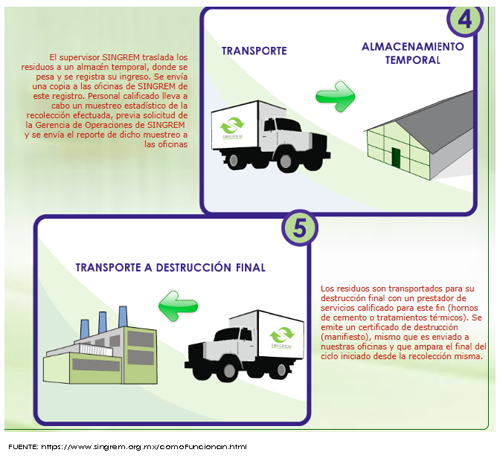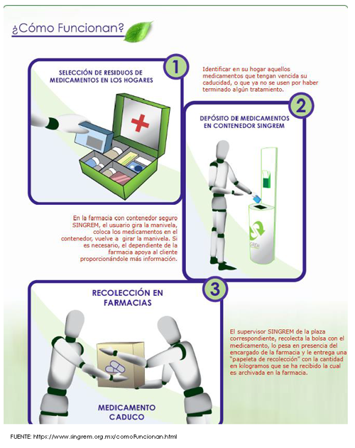 En nuestro país existe una Asociación civil sin fines de lucro Canifarma, se encarga de la recolección y destrucción adecuada de medicamentos vencidos provenientes de los hogares. Este programa es fundamental para prevenir riesgos sanitarios y ambientales, ya que los medicamentos caducos son considerados residuos peligrosos por la Semarnat.