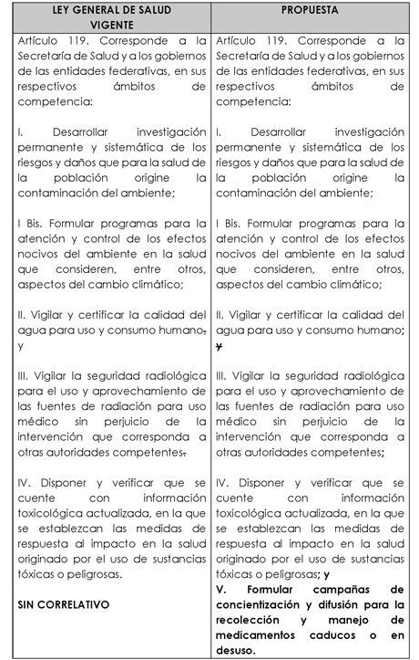 Del resto, ninguna explora el objetivo de esta iniciativa, que es establecer por ley la obligación de habilitar campañas de concientización y difusión para la recolección y manejo de medicamentos caducos o en desuso, siguiendo la implementación en otras regiones del mundo, como acción positiva de las y los integrantes de esta Cámara; en apego a su obligación de proponer legislaciones más actualizadas a nuestros tiempos y con el propósito de continuar con una visión de previsión en materia de salud.