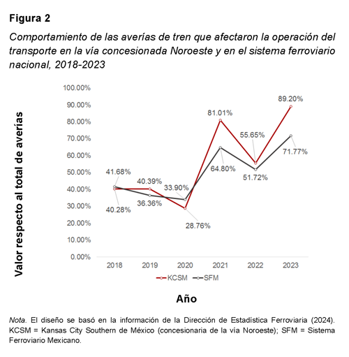 De igual forma, el 40.28% del total de averías en la red gestionada por la citada empresa, afectó el tránsito de trenes en 2018; subiendo a 89.20% para 2023 (véase la Figura 2). Esto contrastó con las tasas nacionales de 41.68% y 71.77%, respectivamente (Dirección de Estadística Ferroviaria, 2024).