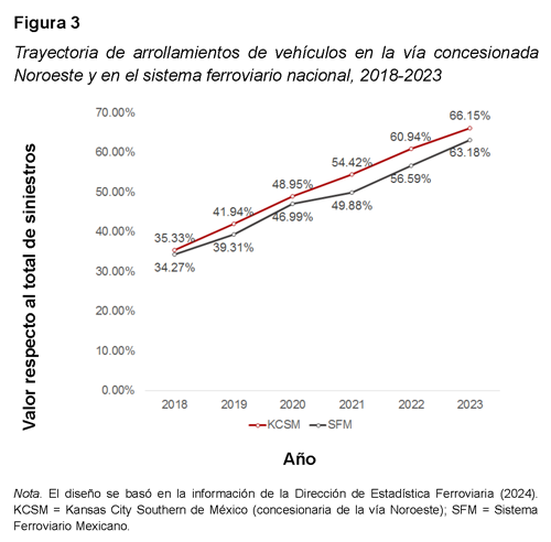 Adicionalmente, de 2018 a 2023, los arrollamientos de vehículos pasaron del 35.33% al 66.15% del total de siniestros (véase la Figura 3); tasas por encima de las nacionales (34.27% y 63.18%, respectivamente; Dirección de Estadística Ferroviaria, 2024).