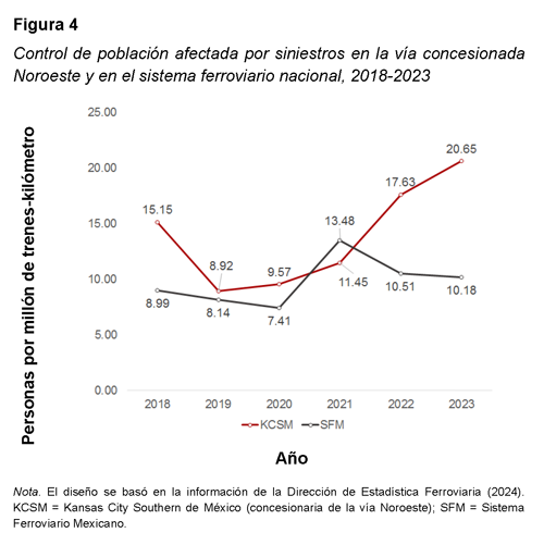 Como efecto de lo anterior, el número de personas muertas y lesionadas sobre la vía concesionada pasó de 15.15 en 2018 a 20.65 en 2023 por millón de trenes-kilómetro (véase la Figura 4; Dirección de Estadística Ferroviaria, 2024).