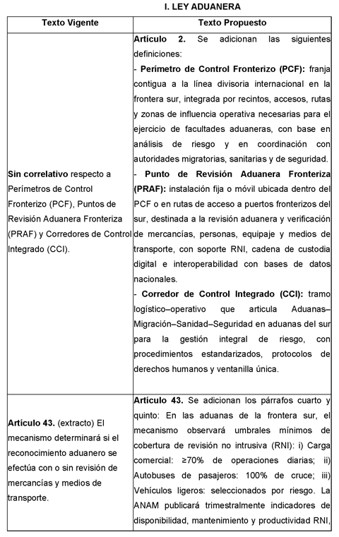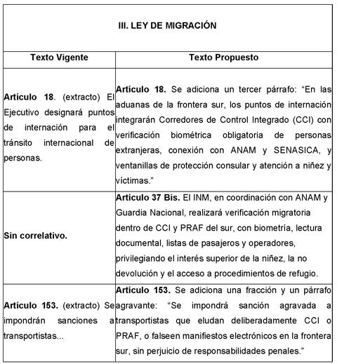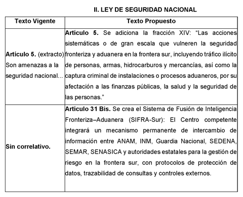 La presente iniciativa busca reformar la Ley Aduanera, la Ley de Seguridad Nacional y la Ley de Migración para dotar al Estado mexicano de herramientas legales y operativas sólidas que permitan blindar la frontera sur, armonizar los estándares de control con los de la frontera norte, e integrar a las distintas autoridades en un sistema eficaz de seguridad fronteriza.