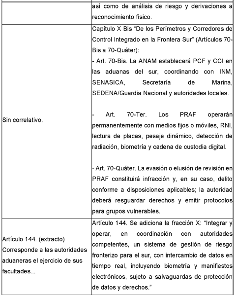 Artículo 70-Bis. La Agencia Nacional de Aduanas de México establecerá y administrará Perímetros de Control Fronterizo y Corredores de Control Integrado en las aduanas de la frontera sur, en coordinación con el Instituto Nacional de Migración, la Secretaría de Marina, la Secretaría de la Defensa Nacional y la Guardia Nacional, así como con las autoridades sanitarias y las autoridades estatales y municipales. Los Perímetros y Corredores tendrán por objeto fortalecer la gestión de riesgo, la trazabilidad y la protección a las personas, sin menoscabo de los derechos humanos y obligaciones internacionales del Estado mexicano.