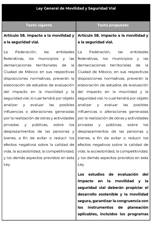 Por lo anterior, se propone adicionar cuatro párrafos al artículo 58 de la Ley General de Movilidad y Seguridad Vial, de acuerdo con la siguiente: