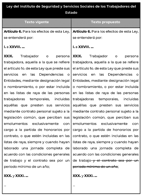Por lo anterior, se propone modificar la fracción XXIX del artículo 6 y el artículo Cuadragésimo Tercero Transitorio de la Ley del Instituto de Seguridad y Servicios Sociales de los Trabajadores del Estado, de acuerdo con la siguiente: