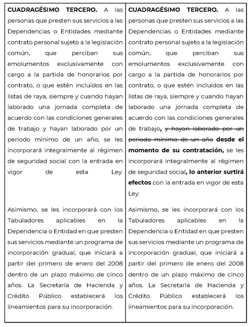 Cuadragésimo Tercero. A las personas que presten sus servicios a las dependencias o entidades mediante contrato personal sujeto a la legislación común, que perciban sus emolumentos exclusivamente con cargo a la partida de honorarios por contrato, o que estén incluidos en las listas de raya, siempre y cuando hayan laborado una jornada completa de acuerdo con las condiciones generales de trabajo, desde el momento de su contratación, se les incorporará integralmente al régimen de seguridad social, lo anterior surtirá efectos con la entrada en vigor de esta Ley.