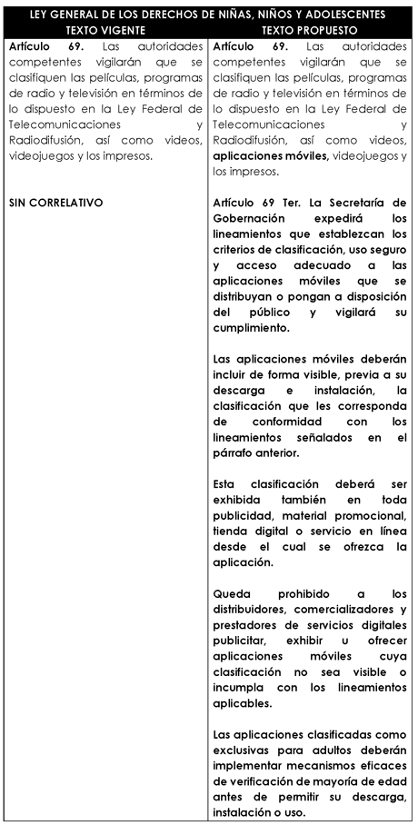 Artículo 69 Ter. La Secretaría de Gobernación expedirá los lineamientos que establezcan los criterios de clasificación, uso seguro y acceso adecuado a las aplicaciones móviles que se distribuyan o pongan a disposición del público y vigilará su cumplimiento.