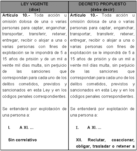Por lo anterior, resulta indispensable establecer una tipificación específica para este ilícito en la normativa nacional, se considera necesaria la reforma a la Ley General para Prevenir, Sancionar y Erradicar los Delitos en Materia de Trata de Personas y para la Protección y Asistencia a las Víctimas de Estos Delitos, a fin de subsanar dicha omisión.