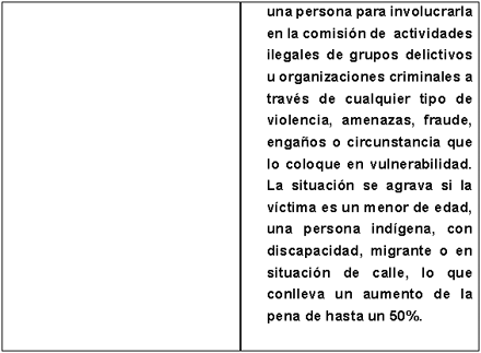 XII. Reclutar, coaccionar, obligar, trasladar o retener a una persona para involucrarla en la comisión de actividades ilegales de grupos delictivos u organizaciones criminales a través de cualquier tipo de violencia, amenazas, fraude, engaños o circunstancia que lo coloque en vulnerabilidad. La situación se agrava si la víctima es un menor de edad, una persona indígena, con discapacidad, migrante o en situación de calle, lo que conlleva un aumento de la pena de hasta un 50 por ciento.