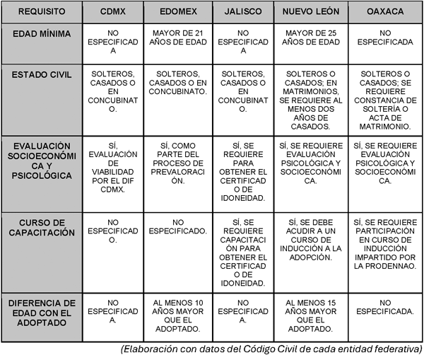 Por otro lado, en México, aunque existe un marco jurídico sólido, la adopción enfrenta importantes obstáculos que retrasan el acceso de niñas y niños a una familia; el mayor cuello de botella está en la etapa previa, los juicios para retirar la patria potestad suelen tardar años, dejando a muchos menores en un limbo jurídico sin poder ser declarados adoptables; a esto se suma la burocracia excesiva: trámites engorrosos, requisitos repetitivos y falta de personal especializado prolongan la espera de las familias adoptantes, lo que desincentiva su participación y retrasa el proceso de integración familiar. En ese sentido, se puede observar que uno de los principales retos de la adopción es la falta de homologación en cuanto a los requisitos y criterios en las distintas entidades, para efectos de ilustración el siguiente cuadro: