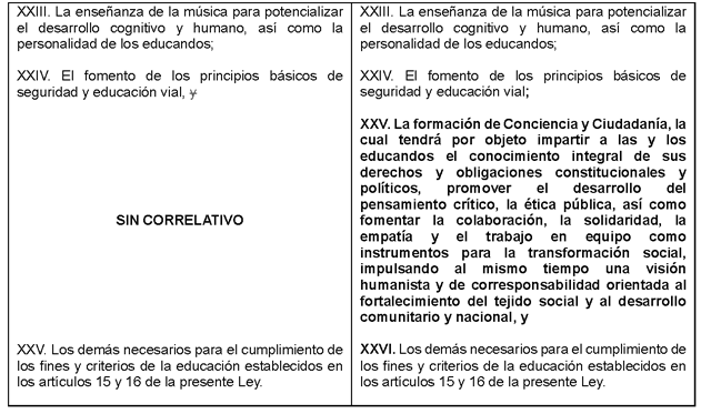 XXV. La formación de Conciencia y Ciudadanía, la cual tendrá por objeto impartir a las y los educandos el conocimiento integral de sus derechos y obligaciones constitucionales y políticos, promover el desarrollo del pensamiento crítico, la ética pública, así como fomentar la colaboración, la solidaridad, la empatía y el trabajo en equipo como instrumentos para la transformación social, impulsando al mismo tiempo una visión humanista y de corresponsabilidad orientada al fortalecimiento del tejido social y al desarrollo comunitario y nacional, y