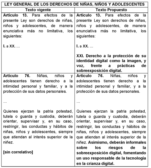 En México, la Constitución reconoce en el artículo 4o. el interés superior de la niñez como principio rector en todas las decisiones del Estado. No obstante, actualmente no existe una regulación específica respecto al sharenting. Además, en la Ley General de los Derechos de Niñas, Niños y Adolescentes considera el derecho a la intimidad, a la protección de datos personales y a la propia imagen. No obstante, aún no contempla de manera expresa la problemática del uso excesivo de sus datos e imágenes en entornos digitales por parte de sus propios padre, madres o tutores, ni medidas preventivas para ellos.