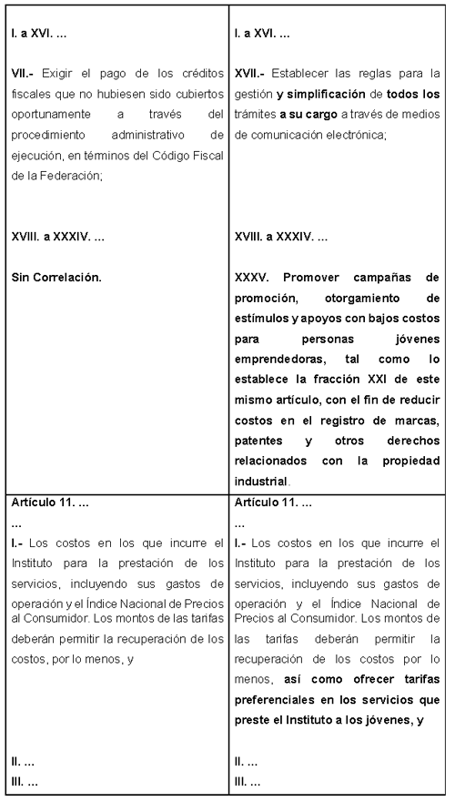 Para mayor claridad de la propuesta de la iniciativa que presento y que tiene por objeto adicionar las fracciones VI al artículo 2 y XXXV al artículo 5, así como reformar las fracciones XVII del artículo 5 y I del 11 de la Ley Federal de Protección a la Propiedad Industrial, me permito ilustrarla con el siguiente cuadro comparativo: