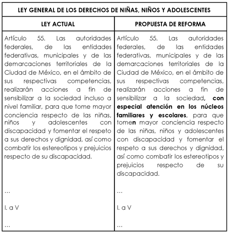Por lo cual, se propone reformar el artículo 55 de la Ley General de los Derechos de Niñas, Niños y Adolescentes con la finalidad de que las autoridades federales, de las entidades federativas, municipales y de las demarcaciones territoriales de la Ciudad de México, en el ámbito de sus respectivas competencias, realicen acciones a fin de sensibilizar a la sociedad, específicamente en los núcleos familiares y escolares, para que tomen mayor conciencia respecto de las niñas, niños y adolescentes con discapacidad y fomentar el respeto a sus derechos y dignidad, así como combatir los estereotipos y prejuicios respecto de su discapacidad.