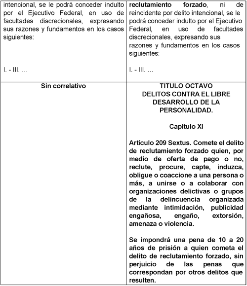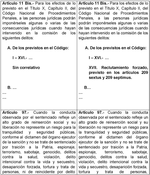 Artículo Primero. Se adiciona la fracción XVII del apartado A del artículo 11 Bis, se reforma el párrafo primero del artículo 97 y se adiciona al Título Octavo el Capítulo XI, Reclutamiento Forzado, y los artículos 209 Sextus y 209 Septimus del Código Penal Federal, para quedar como sigue: