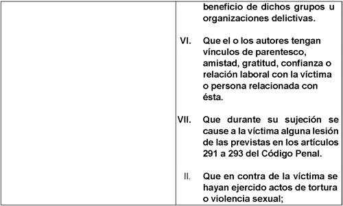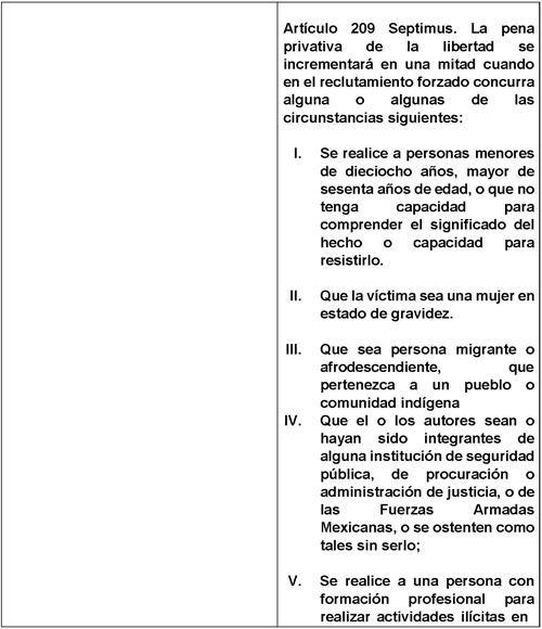 Artículo 209 Septimus. La pena privativa de la libertad se incrementará en una mitad cuando en el reclutamiento forzado concurra alguna o algunas de las circunstancias siguientes: