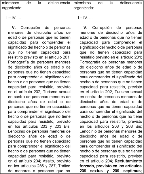 Decreto por el que se adiciona la fracción XVII del apartado A del artículo 11 Bis, se reforma el párrafo del artículo 97 y se adiciona al Título Octavo el Capítulo XI, Reclutamiento Forzado, y los artículos 209 Sextus y 209 Septimus del Código Penal Federal y se reforma la fracción V del artículo 2 de la Ley Federal contra la Delincuencia Organizada