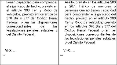V. Corrupción de personas menores de dieciocho años de edad o de personas que no tienen capacidad para comprender el significado del hecho o de personas que no tienen capacidad para resistirlo previsto en el artículo 201; Pornografía de personas menores de dieciocho años de edad o de personas que no tienen capacidad para comprender el significado del hecho o de personas que no tienen capacidad para resistirlo, previsto en el artículo 202; Turismo sexual en contra de personas menores de dieciocho años de edad o de personas que no tienen capacidad para comprender el significado del hecho o de personas que no tiene capacidad para resistirlo, previsto en los artículos 203 y 203 Bis; Lenocinio de personas menores de dieciocho años de edad o de personas que no tienen capacidad para comprender el significado del hecho o de personas que no tienen capacidad para resistirlo, previsto en el artículo 204; Reclutamiento forzado, previsto en los artículos 209 Sextus y 209 Septimus; Asalto, previsto en los artículos 286 y 287; Tráfico de menores o personas que no tienen capacidad para comprender el significado del hecho, previsto en el artículo 366 Ter, y Robo de vehículos, previsto en los artículos 376 Bis y 377 del Código Penal Federal, o en las disposiciones correspondientes de las legislaciones penales estatales o del Distrito Federal;
