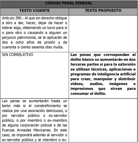 Las penas que correspondan al delito básico se aumentarán en dos terceras partes si para la extorsión se utilizan técnicas, aplicaciones o programas de inteligencia artificial para crear, manipular y distribuir videos, audios, imágenes e impresiones que sirvan para consumar el delito.