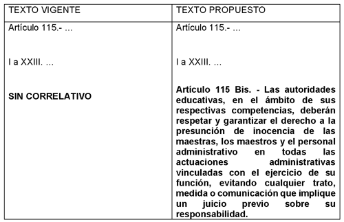 En consecuencia, la adición del artículo 115 Bis a la Ley General de Educación no representa una duplicación normativa ni una invasión competencial, sino una adecuación necesaria del marco sectorial educativo al parámetro constitucional y convencional de derechos humanos. Su incorporación permitirá llenar un vacío legal que hoy deja en situación de vulnerabilidad a maestras, maestros y personal administrativo, garantizará que las actuaciones administrativas de las autoridades educativas respeten el principio de presunción de inocencia y hará efectivo el mandato constitucional de revalorizar al magisterio. Así, la reforma propuesta no solo armoniza la legislación nacional con los estándares internacionales y con la doctrina constitucional más avanzada, sino que refuerza la calidad y legitimidad del sistema educativo al asegurar que los derechos de todos sus actores sean plenamente respetados en un Estado democrático de derecho.