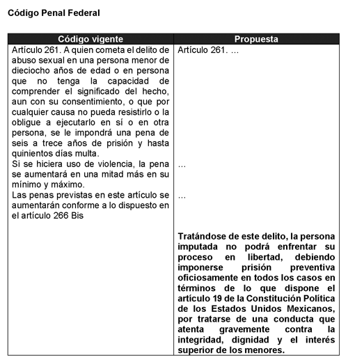 La propuesta parte del reconocimiento de la gravedad del delito de abuso sexual infantil y de la urgente necesidad de establecer medidas más estrictas que garanticen una respuesta penal proporcional y eficaz. En este sentido, se plantea que las personas imputadas por este delito no puedan llevar su proceso en libertad, imponiéndose prisión preventiva oficiosa, dado el daño profundo e irreparable que dichas conductas generan en las víctimas, en atención al principio del interés superior de la niñez.