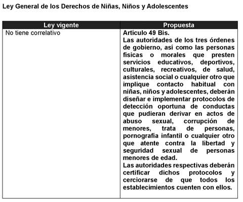 Asimismo, se propone la obligación, por parte de instituciones y empleadores que trabajan con menores de edad, de establecer protocolos de detención oportuna de conductas que pudieran derivar en abuso sexual, lo que contribuye a establecer entornos seguros y libres de violencia.