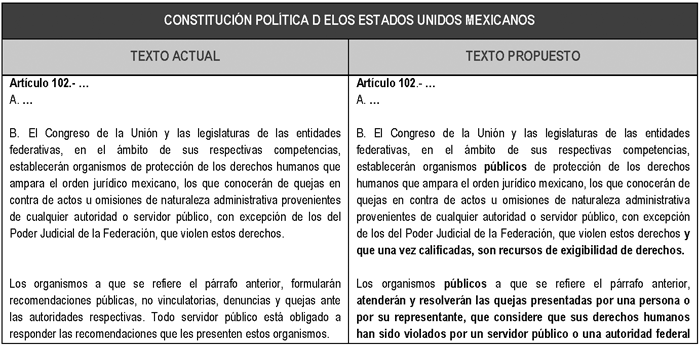 Por lo que algunos representantes de organismos públicos y defensores de derechos humanos han propuesto reformas legales principalmente de carácter constitucional para hacer que las recomendaciones sean vinculantes con el objetivo de fortalecer la protección de los derechos humanos al obligar a las autoridades a cumplir con ellas, reduciendo así la impunidad y aumentando la confianza en el sistema de defensa de derechos humanos.