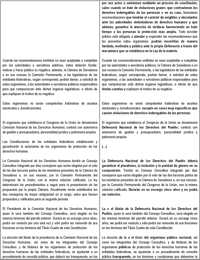 Que el nuevo organismo público que se propone garantice el pluralismo, la inclusión y la paridad de género y que se consolide como una Defensoría Nacional de los Derechos del Pueblo como una defensora en donde su autonomía e independencia en el actuar permita mejorar una ética institucional y colectiva cuyo eje comprenda, impulse y abrace los derechos humanos.