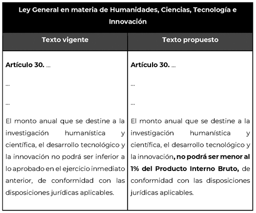 Por lo anterior se propone modificar el párrafo cuarto del artículo 30 de la Ley General en materia de Humanidades, Ciencias, Tecnologías e Innovación, de acuerdo con la siguiente