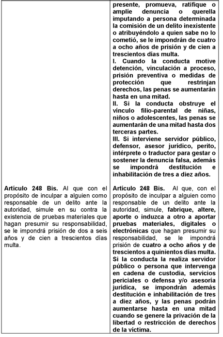 Artículo 248 Bis. Al que, con el propósito de inculpar a alguien como responsable de un delito ante la autoridad, simule, fabrique, altere, aporte o induzca a otro a aportar pruebas materiales, digitales o electrónicas que hagan presumir su responsabilidad, se le impondrá prisión de cuatro a ocho años y de trescientos a quinientos días multa.